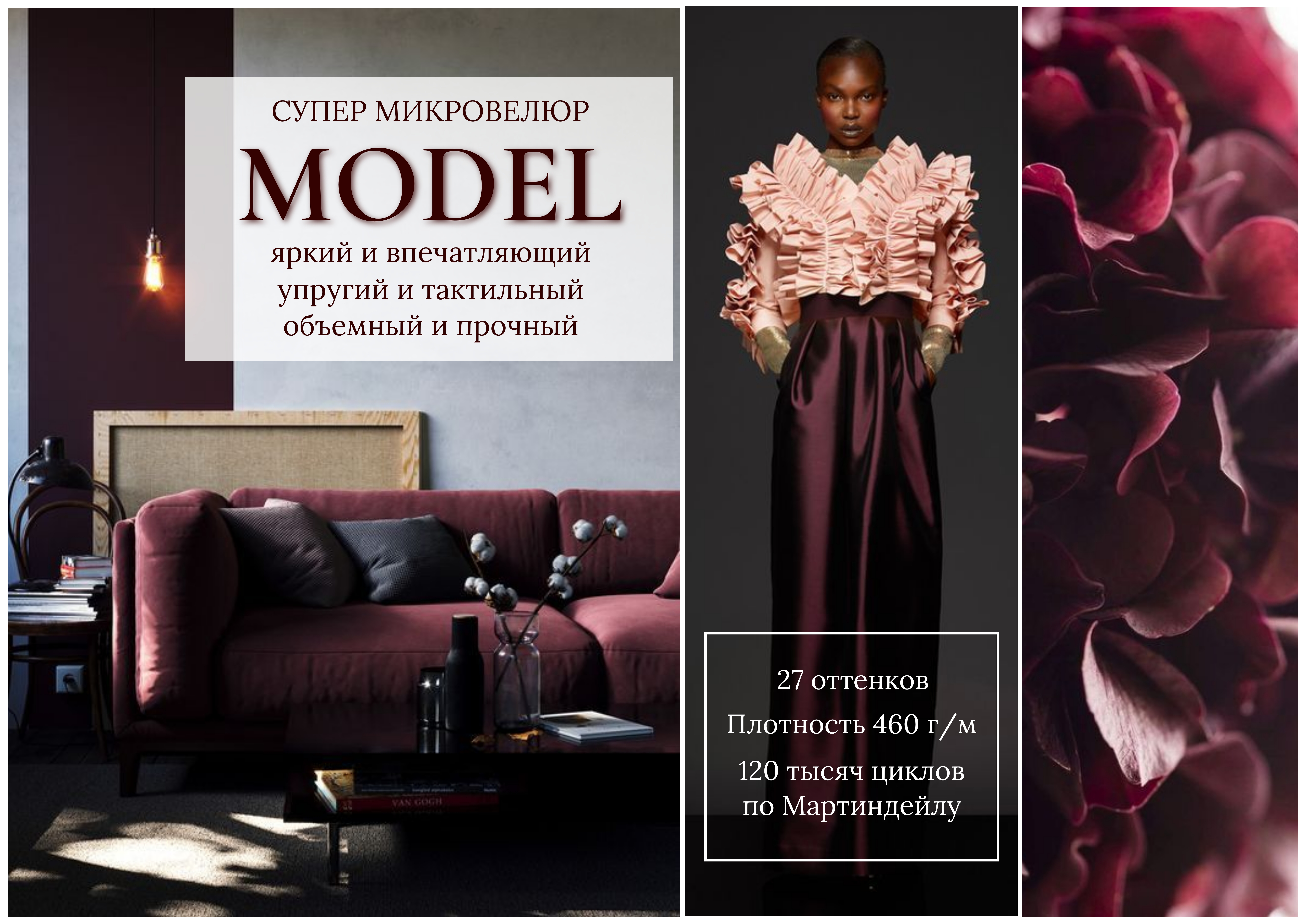 Наша новая коллекция микровелюров Model по характеру очень схожа с молодой супер моделью, у которой есть все для успешной карьеры. Она обладает выраженной индивидуальностью, завораживает внешним видом и цветовой гаммой. Здесь найдутся цвета лимонно-мятных леденцов, клубничного щербета и бутылочного стекла, мягкие оттенки верблюжьей шерсти, мха и розовых лепестков, а также белый и черный для самого элегантного решения.